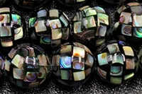 天然のアワビ貝(パウアシェル)を細かく砕き、モザイク状に貼り合わせた美しいビーズ。角度によってブルー、グリーン、パープルなど多彩な光を放ちます。